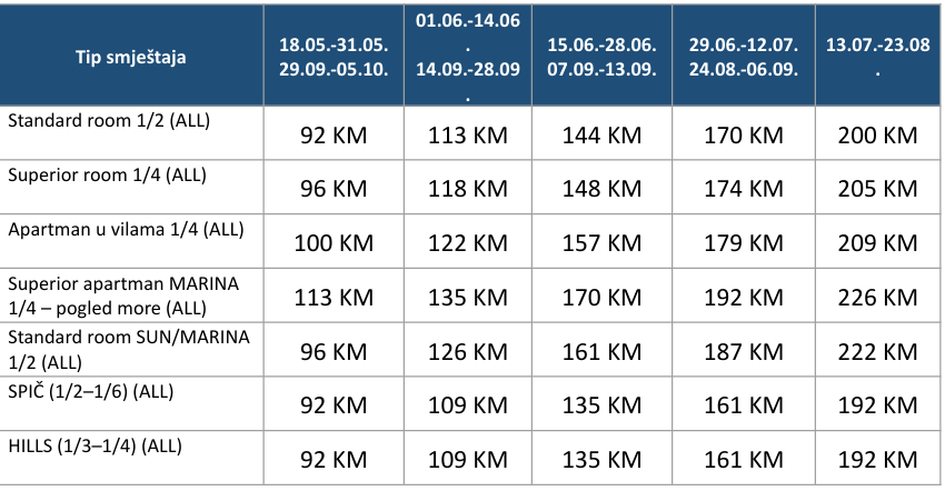 Cijene izražene u tabeli su po osobi i danu. Boravišna taksa iznosi 4 KM za odrasle, te 2 KM za djecu do 11,99 godina, po osobi po danu.
