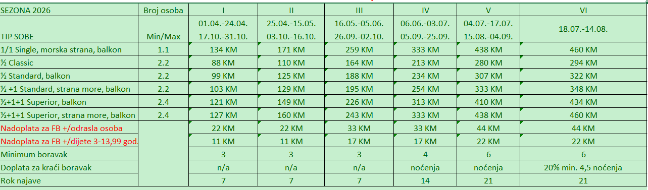 Cijene izražene u tabeli su po osobi i danu. Boravišna taksa uključena.