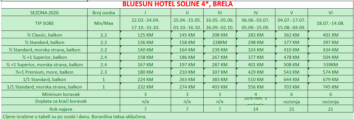 Bluesun Hotel Soline 4* se nalazi u mirnoj uvali Brela, okružen borovim drvećem i u neposrednoj blizini kamenito-šljunčane plaže, što ga čini idealnim za goste koji traže spoj prirode, komfora i mora. Lokacija pruža prelijep pogled na Jadransko more i ostrvo Brač — savršeno za odmor iz snova.